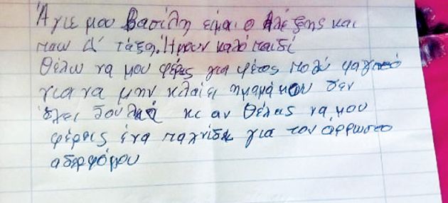 ❱❱ «Τσουνάμι» αλληλεγγύης έχει σηκώσει το γράμμα (φωτό) που έστειλε στον Αγιο Βασίλη ο μικρούλης Αλέξης, ζητώντας από τον αγαπημένο άγιο των παιδιών όχι κάποιο παιχνίδι, αλλά φαγητό! Αντίθετα από τους συνομηλίκους του, το οκτάχρονο αγόρι δεν ζητά ούτε τάμπλετ ούτε κινητό ούτε ηλεκτρονικά παιχνίδια, αλλά μόνο ό,τι θα κάνει καλύτερη τη ζωή της οικογένειάς του: την καθημερινή τροφή!