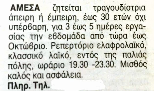 Η αγγελία δημοσιεύτηκε στα «Χανιώτικα Νέα» και αναφέρει: «Αμεσα ζητείται τραγουδίστρια άπειρη ή έμπειρη, έως 30 ετών, όχι υπέρβαρη, για τρεις έως πέντε μέρες εργασίας την εβδομάδα, από τώρα έως τον Οκτώβριο. Ρεπερτόριο ελαφρολαϊκό, κλασικό λαϊκό, εντός της παλιάς πόλης, ωράριο 19.30 – 23.30. Μισθός καλός και ασφάλεια. Πληρ. Τηλ. 698…»