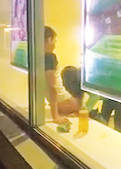 Η νεαρή άρχισε να κάνει στοματικό σεξ στον άντρα χωρίς να πτοείται από το γεγονός ότι όσοι περνούσαν έξω από την τράπεζα μπορούσαν να τους δουν. Οι περισσότεροι σχολίασαν ότι κατά πάσα πιθανότητα οι δύο εραστές ήταν μεθυσμένοι, καθώς δίπλα τους υπήρχε ένα μπουκάλι μπίρας.