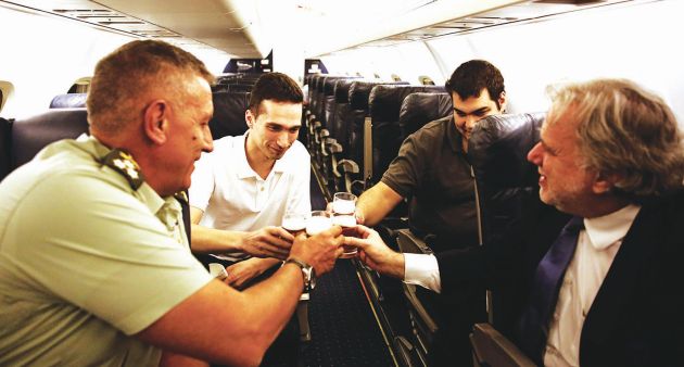 Χαμόγελα ανακούφισης πλημμύρισαν την καμπίνα του πρωθυπουργικού αεροσκάφους μόλις η πόρτα επιβίβασης έκλεισε ερμητικά, επισφραγίζοντας την οριστική λήξη της πεντάμηνης περιπέτειας των δύο Ελλήνων στρατιωτικών.