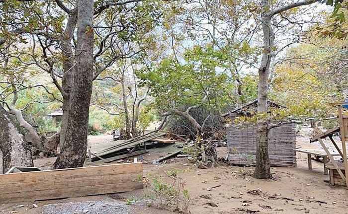 Ο ποταμός Άχλας που διασχίζει τον υγροβιότοπο και κατά συνέπεια το συγκρότημα «Οναρ» φούσκωσε και στο άγριο πέρασμά του προς τη θάλασσα δεν άφησε τίποτα όρθιο, όπως φαίνεται και στις εικόνες καταστροφής που δημοσιεύει το site Εν Ανδρω.