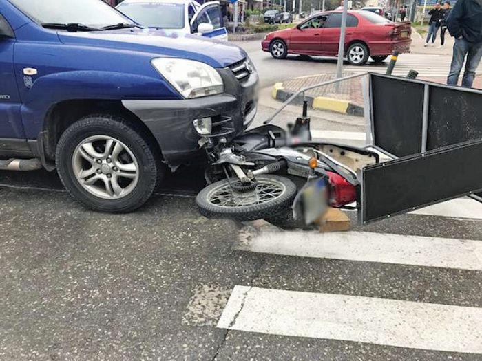 Ο διανομέας δεν πρόλαβε να σταματήσει, έπεσε πάνω στο Ι.Χ. και κατέληξε με σφοδρότητα στο οδόστρωμα, ενώ το μηχανάκι σφηνώθηκε κάτω από το αυτοκίνητο. Όσοι από τα γύρω καταστήματα έσπευσαν να βοηθήσουν τον διανομέα, διαπίστωσαν με ανακούφιση ότι ήταν μεν τραυματισμένος, όμως είχε γλιτώσει από βέβαιο θάνατο καθώς φορούσε κράνος.