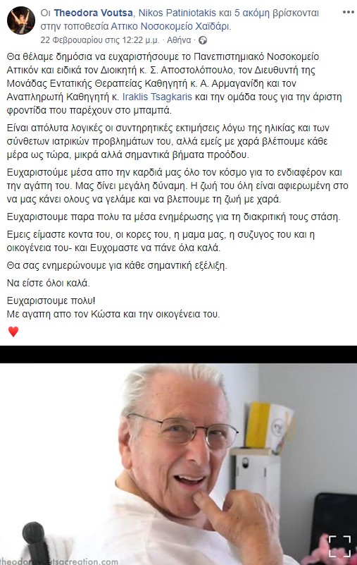 «Θα θέλαμε δημόσια να ευχαριστήσουμε το Πανεπιστημιακό Νοσοκομείο ”Αττικόν”, και ειδικά τον διοικητή κ. Σ. Αποστολόπουλο, τον διευθυντή της Μονάδας Εντατικής Θεραπείας, καθηγητή κ. Α. Αρμαγανίδη, και τον αναπληρωτή καθηγητή κ. Iraklis Tsagkaris και την ομάδα τους για την άριστη φροντίδα που παρέχουν στον μπαμπά. Είναι απόλυτα λογικές οι συντηρητικές εκτιμήσεις λόγω της ηλικίας και των σύνθετων ιατρικών προβλημάτων του, αλλά εμείς με χαρά βλέπουμε κάθε μέρα ως τώρα μικρά, αλλά σημαντικά βήματα προόδου. Ευχαριστούμε μέσα από την καρδιά μας όλον τον κόσμο για το ενδιαφέρον και την αγάπη του. Μας δίνει μεγάλη δύναμη. Η ζωή του όλη είναι αφιερωμένη στο να μας κάνει όλους να γελάμε και να βλέπουμε τη ζωή με χαρά. Ευχαριστούμε πάρα πολύ τα μέσα ενημέρωσης για τη διακριτική τους στάση. Εμείς είμαστε κοντά του, οι κόρες του, η μαμά μας, η σύζυγός του και η οικογένειά του, και ευχόμαστε να πάνε όλα καλά».