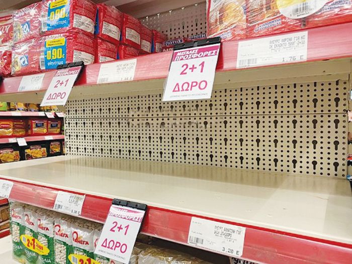Στη Θεσσαλονίκη παρατηρείται φαινόμενο πολέμου σε αλυσίδες τροφίμων Cash and Carry, που πουλάνε χονδρική, αλλά και σε αλυσίδα γερμανικής εταιρίας που έβγαλε προσφορές, ενώ τα ράφια στα καταστήματα πώλησης τροφίμων αδειάζουν λες και οι καταναλωτές θα κλειστούν στα σπίτια τους για κανένα μήνα! «Ερχονται τις δύο τελευταίες ημέρες και αγοράζουν προϊόντα και τρόφιμα μακράς διάρκειας» δηλώνει ο ιδιοκτήτης της αλυσίδας «Θερμαϊκός» Σταύρος Μαυρομιχάλης.