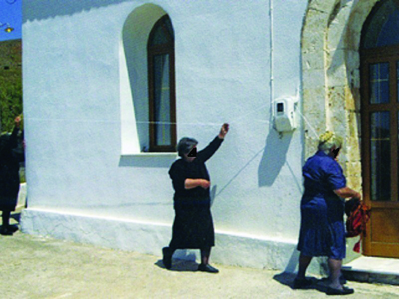 Μάλιστα, όπως αποκάλυψαν, μία γιαγιά προέτρεψε τις γυναίκες του συλλόγου να ζητήσουν τη βοήθεια του Αγίου Μηνά. Όπως τους είπε η Κατίνα Νοικοκυράκη, το «ζώσιμο» το έκαναν παλιά η μητέρα της και ο θείος της, που ήταν νεωκόρος στην εκκλησία αυτή: «Έζωναν τον Αγιο και το κακό έφευγε… Πρέπει να προσέχουμε και να τηρούμε όσα μας λένε οι ειδικοί, αλλά να μην ξεχνάμε την πίστη μας» είπε στο cretalive.gr, προσθέτοντας ότι ο περισχοινισμός γίνεται από ειδικό νήμα, τρεις φορές επί 40 ημέρες.