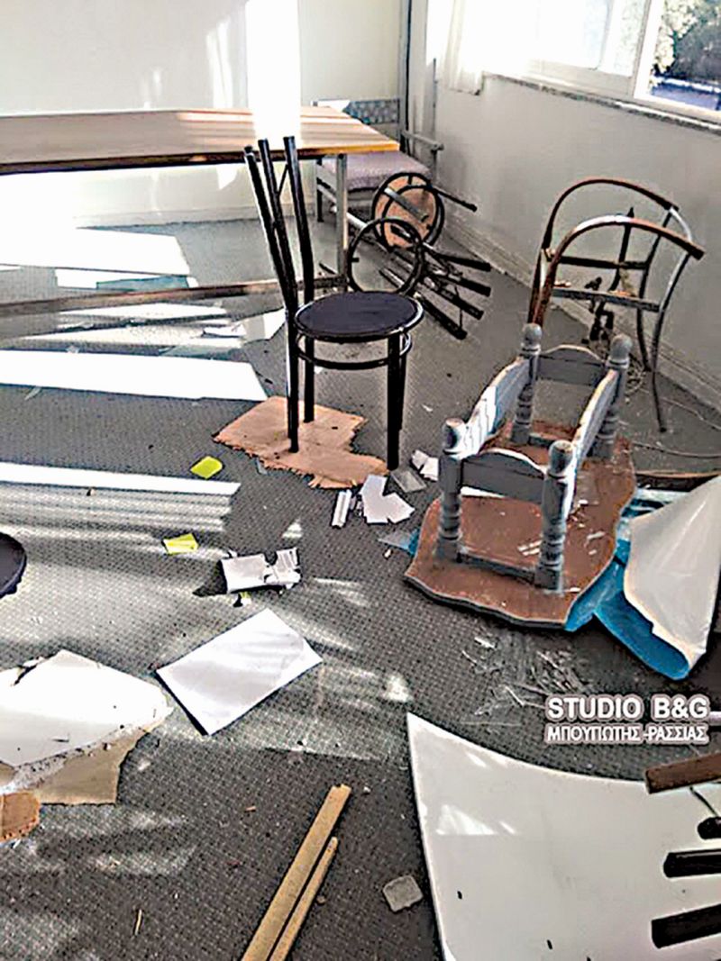 Σπασμένες πόρτες, αναποδογυρισμένα τραπέζια, ξεχαρβαλωμένες καρέκλες, κατεστραμμένοι υπολογιστές και σκουπίδια διάσπαρτα παντού συνθέτουν το σκηνικό στο ξενοδοχείο «Γαλαξίας» της Ερμιονίδας όπου φιλοξενούνται 470 μετανάστες από την Αφρική.