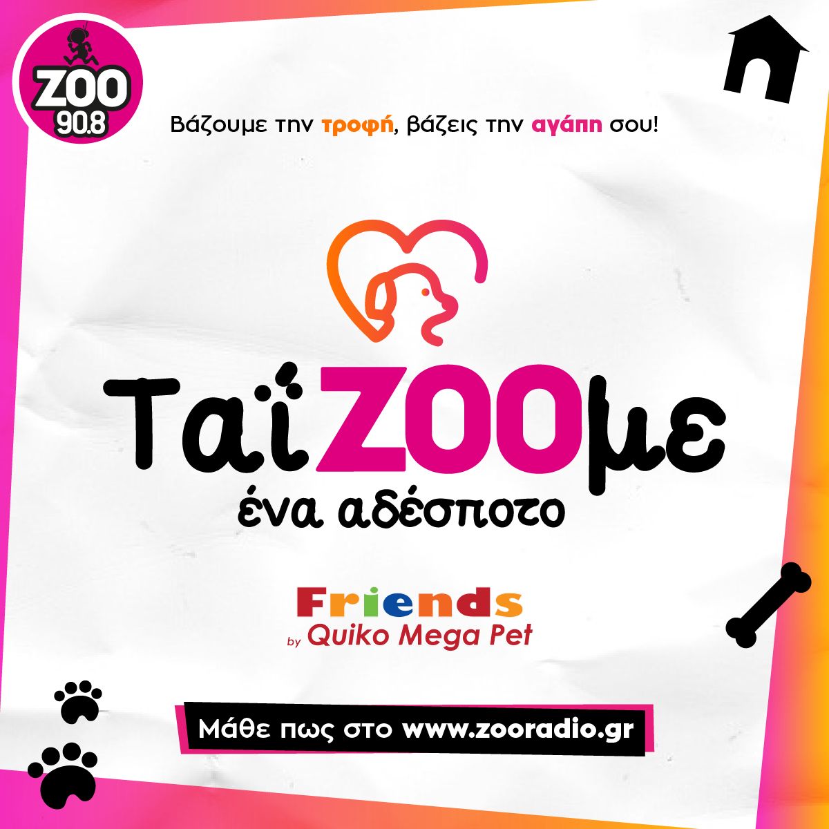Ο ραδιοφωνικός σταθμός Zoo 90.8, μέσω της πρωτοβουλίας Κοινωνικής Υπευθυνότητας «ταίZOOμε ένα αδέσποτο» και με πολύτιμο σύμμαχο τα καταστήματα Quiko Mega Pet συμβάλλει με έμπρακτο τρόπο στην ανάγκη σίτισης και φροντίδας των αδέσποτων ζώων εν καιρώ πανδημίας και αναλαμβάνει να παρέχει τροφή σε κάθε ακροατή του για να ταΐσει κάποιο αδέσποτο της γειτονιάς του, σκύλο ή γάτα.