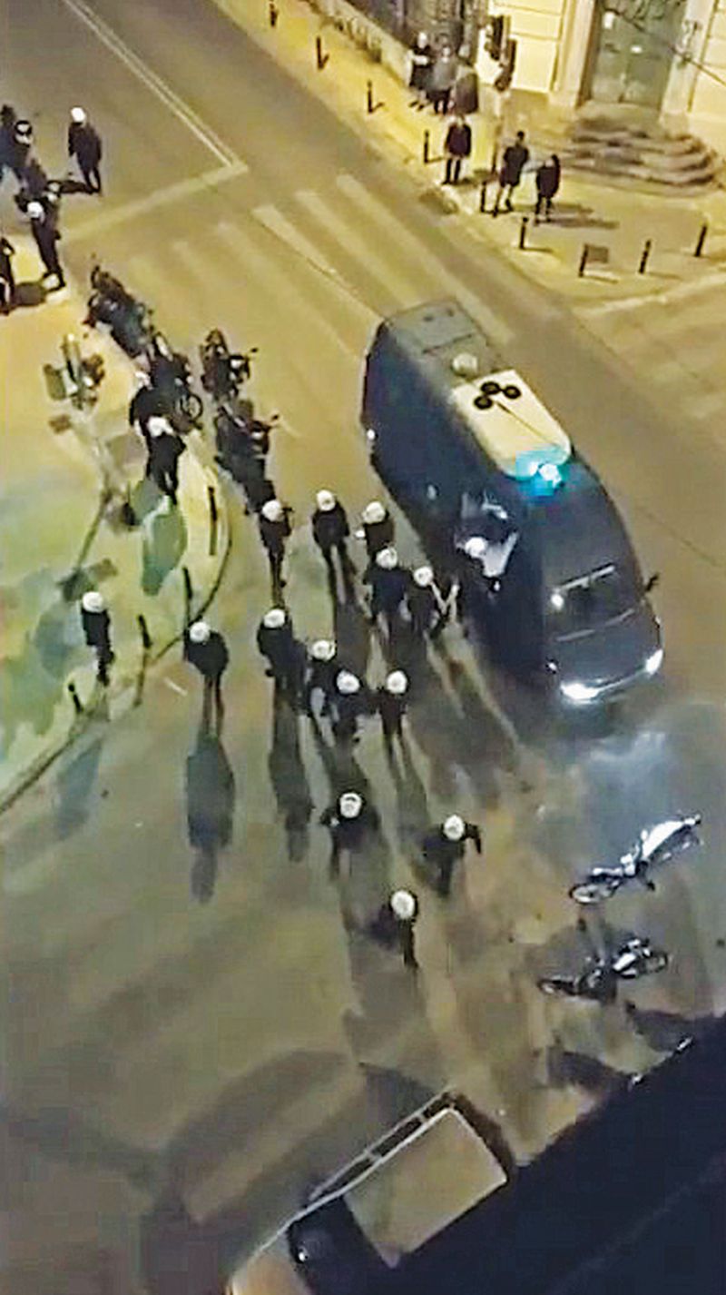 Τότε η διέλευση περιπολικών από την πλατεία Αγίου Γεωργίου, όπου είχε στηθεί υπαίθριο πάρτι με μπίρες και μουσική, προκάλεσε την επίθεση των συγκεντρωμένων κατά των αστυνομικών.