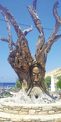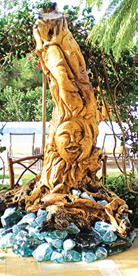 Ομως, πριν περάσει κανείς μέσα στο τουριστικό θέρετρο, το βλέμμα του θα μαγνητίσει το εκπληκτικό σκαλιστό δέντρο, έργο τέχνης του Κρητικού Σπύρου Στεφανάκη.