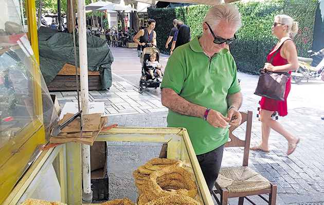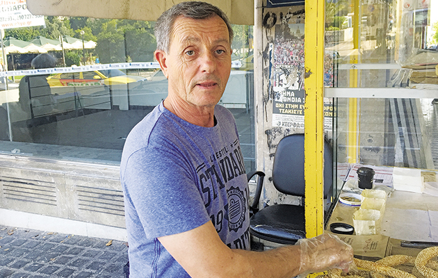 Εχει τύχει περαστικοί να πουν “έχω μόνο 20 λεπτά, μου δίνεις ένα κουλουράκι;” κι εγώ, καταλαβαίνοντας το ζόρι, να τους το δώσω! Τις καλές μέρες μπορείς να βγάλεις μεροκάματο και 30 ευρώ, ωστόσο έχουν υπάρξει μέρες που το κέρδος δεν ξεπερνά τα 10 ευρώ. Δεν χάνω την αισιοδοξία μου, βέβαια. Θέλω να σκέφτομαι θετικά, γιατί αυτός είναι ο μόνος τρόπος» είπε στην «Espresso» ο άνθρωπος που βγάζει καθημερινά το μεροκάματό του στον δρόμο ανεξαρτήτως καιρικών συνθηκών.